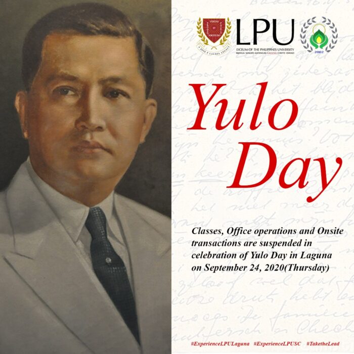 Classes, Office operations, and onsite transactions are suspended in celebration of Yulo Day on September 24, 2020(Thursday) in Laguna. Please disseminate.