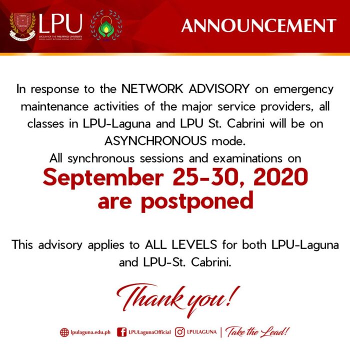 JUST IN: In response to the NETWORK ADVISORY on emergency maintenance activities of the major service providers, all classes in LPU-Laguna and LPU St. Cabrini will be on ASYNCHRONOUS mode. This means all synchronous sessions and examinations from September 25 to 30 are postponed. This advisory applies to ALL LEVELS for both LPU-Laguna and LPU-St.…