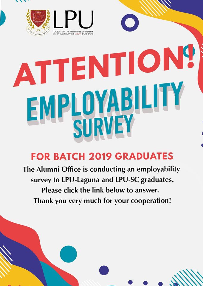 The Alumni Office is conducting an employability survey to LPU-Laguna and LPU-SC graduates.