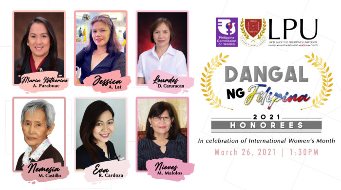 Dangal ng Filipina 2021 Honorees In celebration of the International Women’s Month, with the Philippine Commission on Women, LPU – Laguna and LPU St. Cabrini School of Health Sciences Inc. will have its first Parangal sa Kababaihan on March 26, 2021. We are pleased to present to you the Honorees for the Dangal ng Filipina…