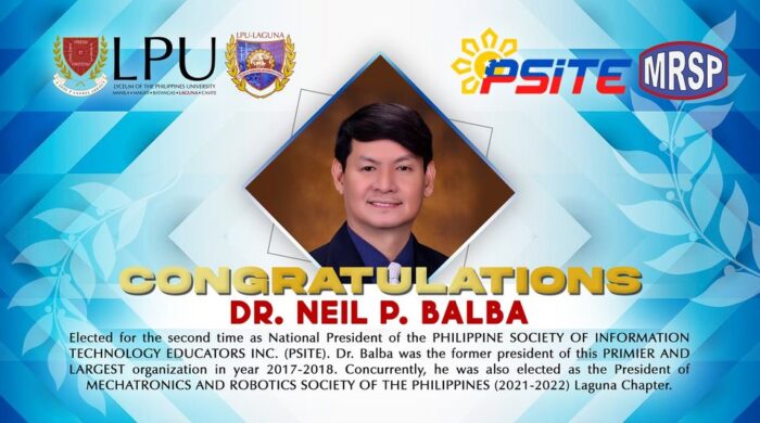 CONGRATULATIONS DR. NEIL P. BALBA, for being elected for the second time as NATIONAL PRESIDENT of the PHILIPPINE SOCIETY OF INFORMATION TECHNOLOGY EDUCATORS INC. (PSITE). Dr. Balba was the former President of this Premier and Largest organization in the year 2017-2018. Concurrently, he was also elected as the President of MECHATRONICS AND ROBOTICS SOCIETY…