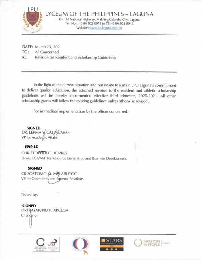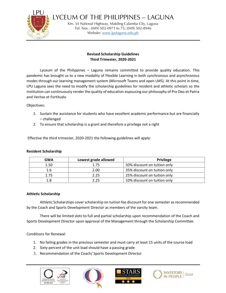 As presented during the Chancellor’s hour with the LSSC held on March 29, 2021, please be guided by the modified scholarship policy beginning 3rd trimester herewith attached: