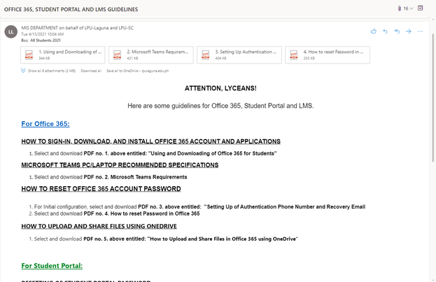 Please check your the Inbox of your LPU emails for the Guidelines/Work Instructions on How to Reset your Password on LMS, Student Portal, and Office 365 Accounts.