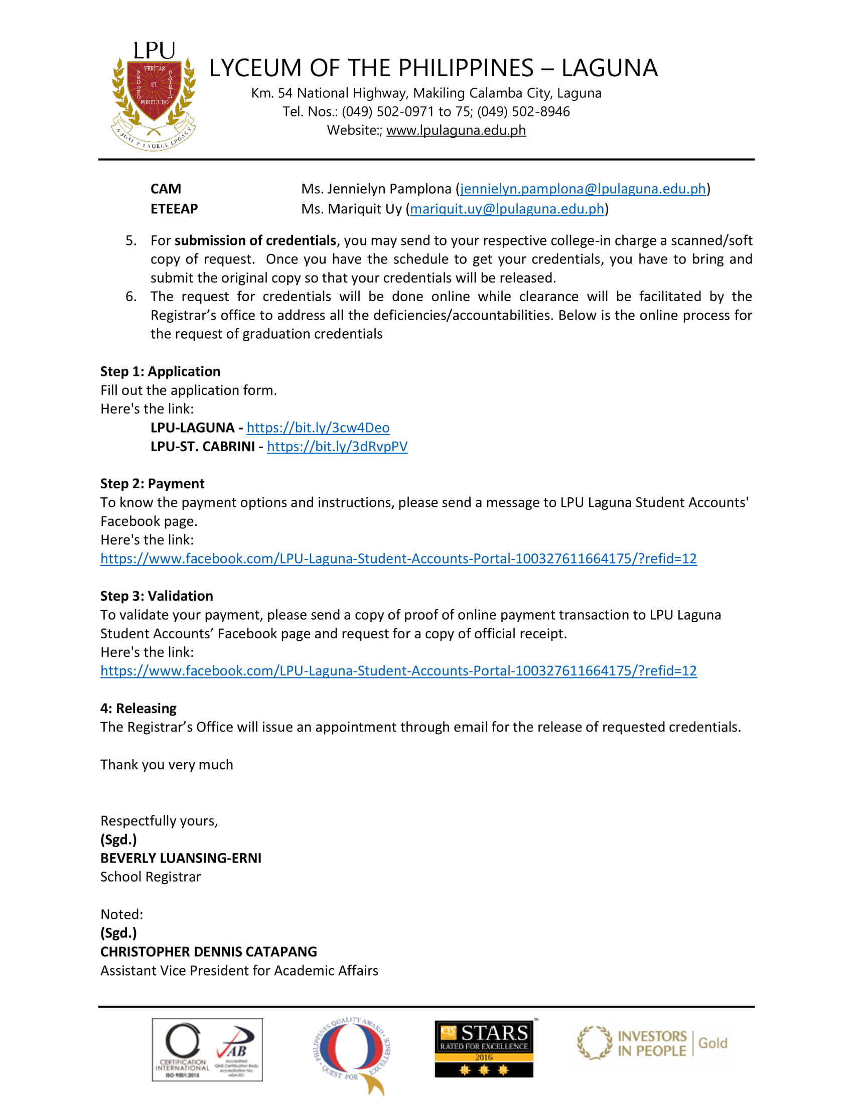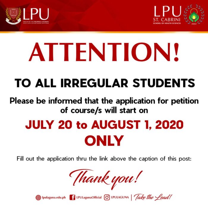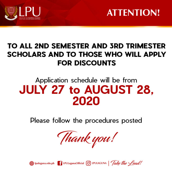 ENROLLMENT PROCEDURE FOR NEW COLLEGE STUDENTS 1. GET AN APPLICATION NUMBER. To generate an application number, please use the link below: https://students.lpulaguna.edu.ph/StudentPortal/Login.php 2. FILL OUT THE APPLICATION FORM. Fill out the application form through the link provided: FOR LPU-LAGUNA PROGRAMS: https://forms.office.com/Pages/ResponsePage.aspx?id=zVk4F18jtEu7TX-qVBZHdoAEtw0LvCVGlJ57N1seA3lUOVhTRDFVUVNXNUE3UFZORTNLNU9MR1VYUy4u FOR LPU-ST. CABRINI SCHOOL OF HEALTH SCIENCES, INC. PROGRAMS: https://forms.office.com/Pages/ResponsePage.aspx?id=zVk4F18jtEu7TX-qVBZHdoAEtw0LvCVGlJ57N1seA3lUNjYzRzRFOUc2RkFVUkpXNFAxODhDVVQwWS4u …