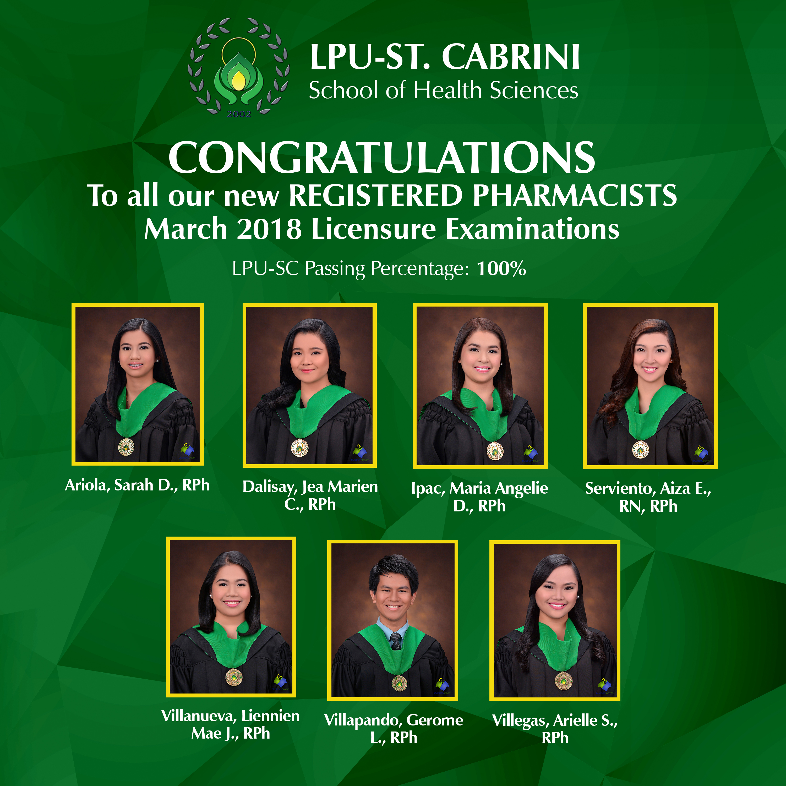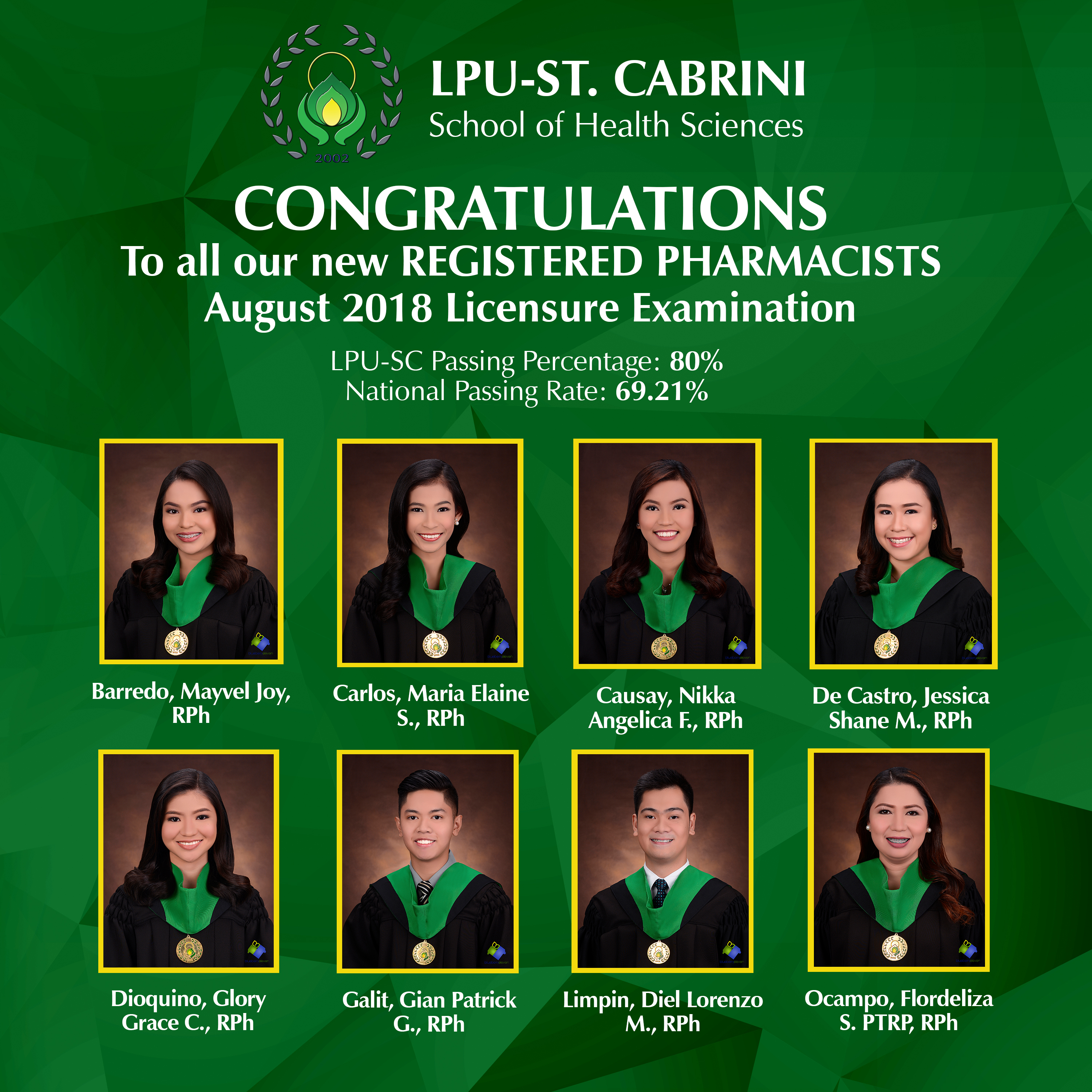 Barredo, Mayvel Joy, RPh Carlos, Maria Elaine S., RPh Cuasay, Nikka Angelica F., RPh De Castro, Jessica Shane M., RPh Dioquino, Glory Grace C., RPh Galit, Gian Patrick G., RPh Limpin, Diel Lorenzo M., RPh Ocampo, Flordeliza S., PTRP, RPh