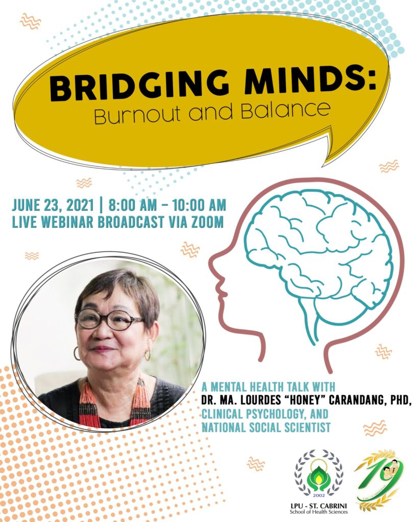 As part of the LPU-St. Cabrini School of Health Sciences’ 19th Founding Anniversary, we are inviting all of you to join us on June 23, 2021, 8:00 am – 11:00am with Dra. Honey Carandang to learn and understand the what’s and whys of burnout and balance.
