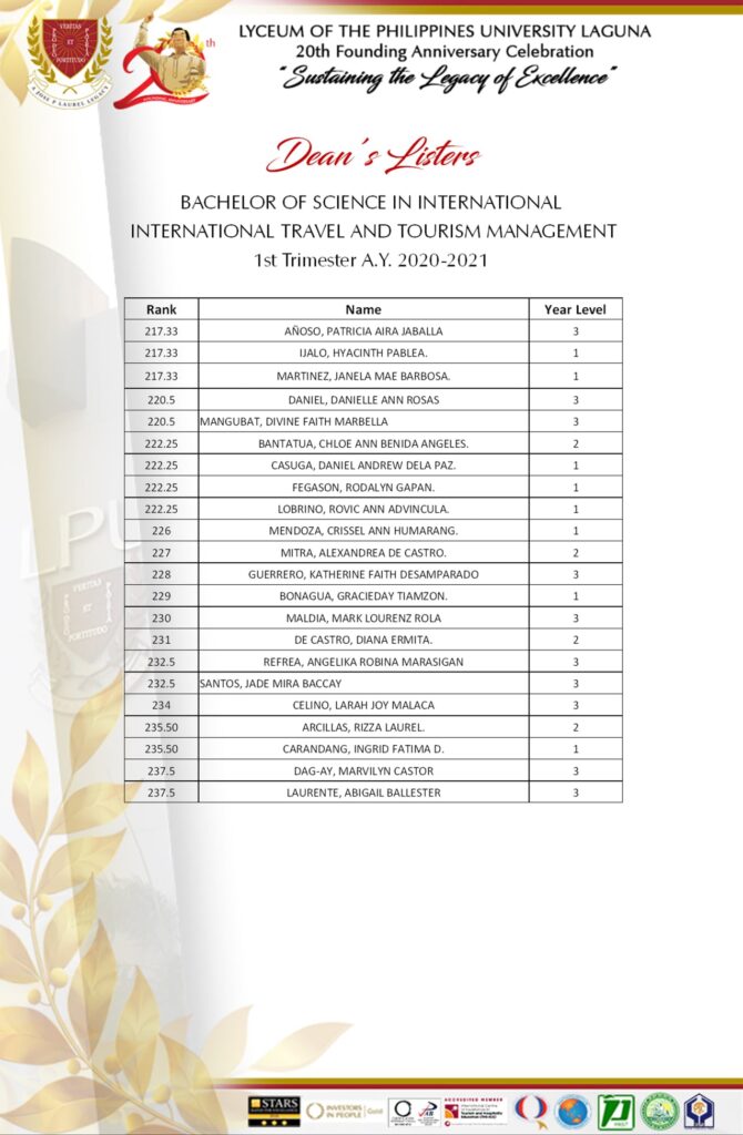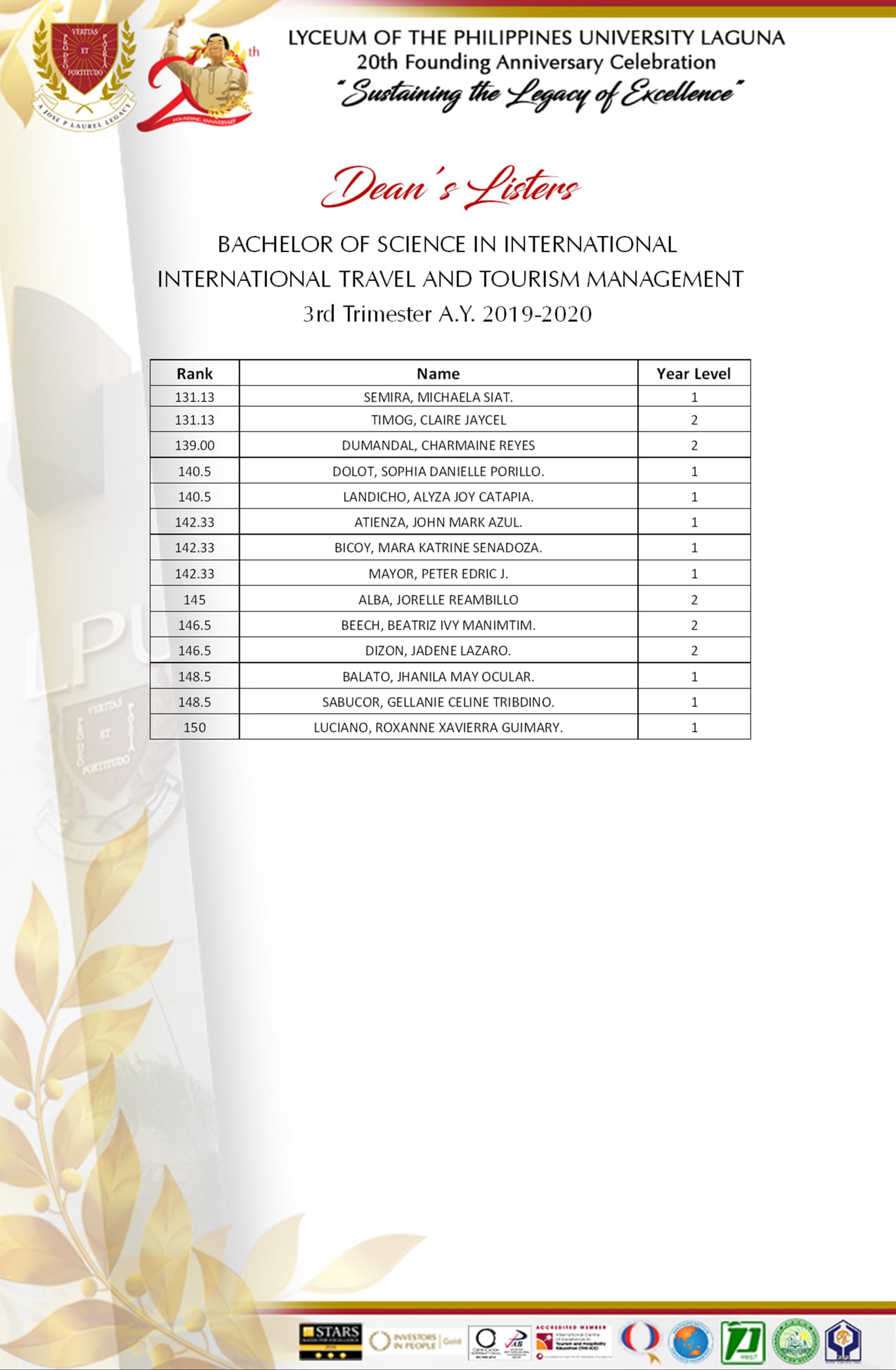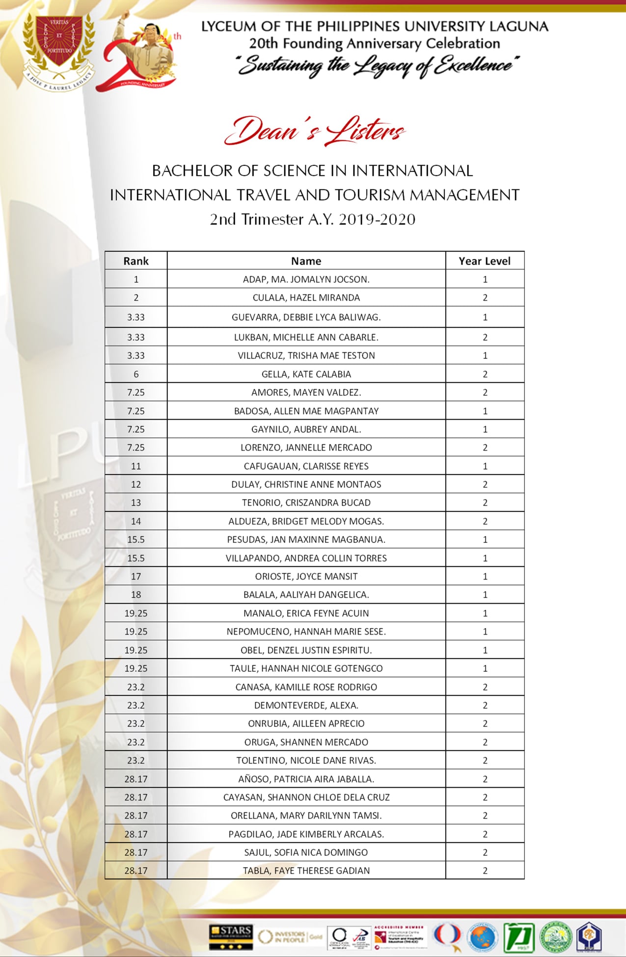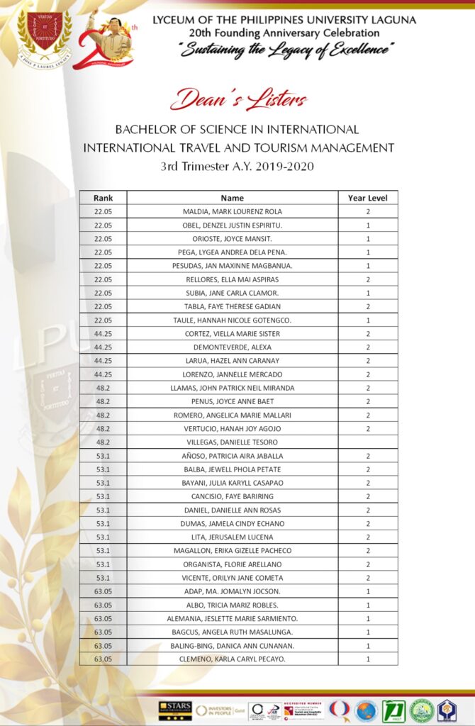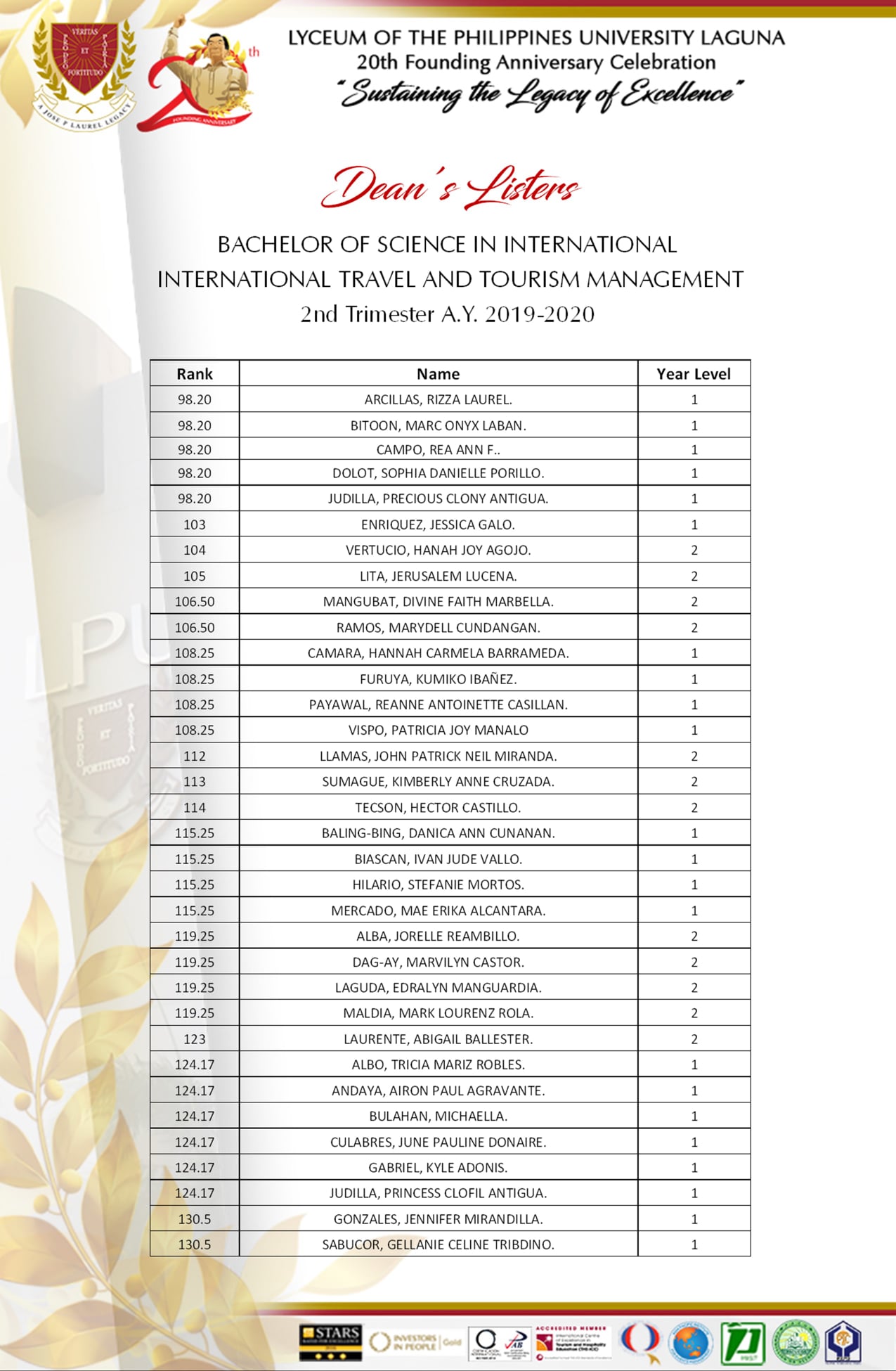 Category: 20th Foundation Celebration, Activity, Dean's Listers RecognitionBy Tristan Jay EstudilloApril 8, 2021 Author: Tristan Jay Estudillo Related postsBridging Minds: Burnout and Balance (LPU-SC Event)June 18, 2021The Joy of Giving: Sustaining Our Commitment to ServeMay 30, 2021Congratulations to Micaella Arcemo, one of the Top 80 delegates to the Ayala Young Leaders Congress 2021May 28, 2021How to Join JUMP-START 2021?May 27, 2021JUMP-START 2021: A Webinar on Job Readiness, and Virtual Career Fair of LPU-LagunaMay 24, 2021Virtual Completion Ceremony AY 2019-2020May 20, 2021