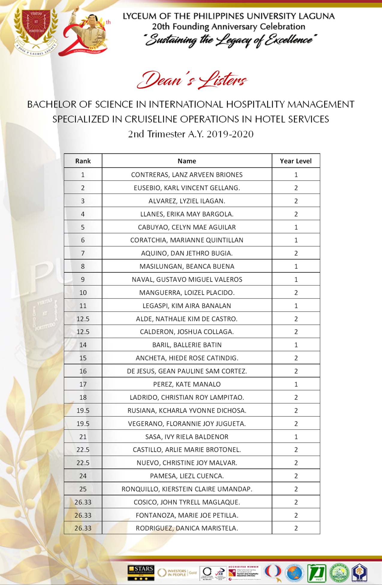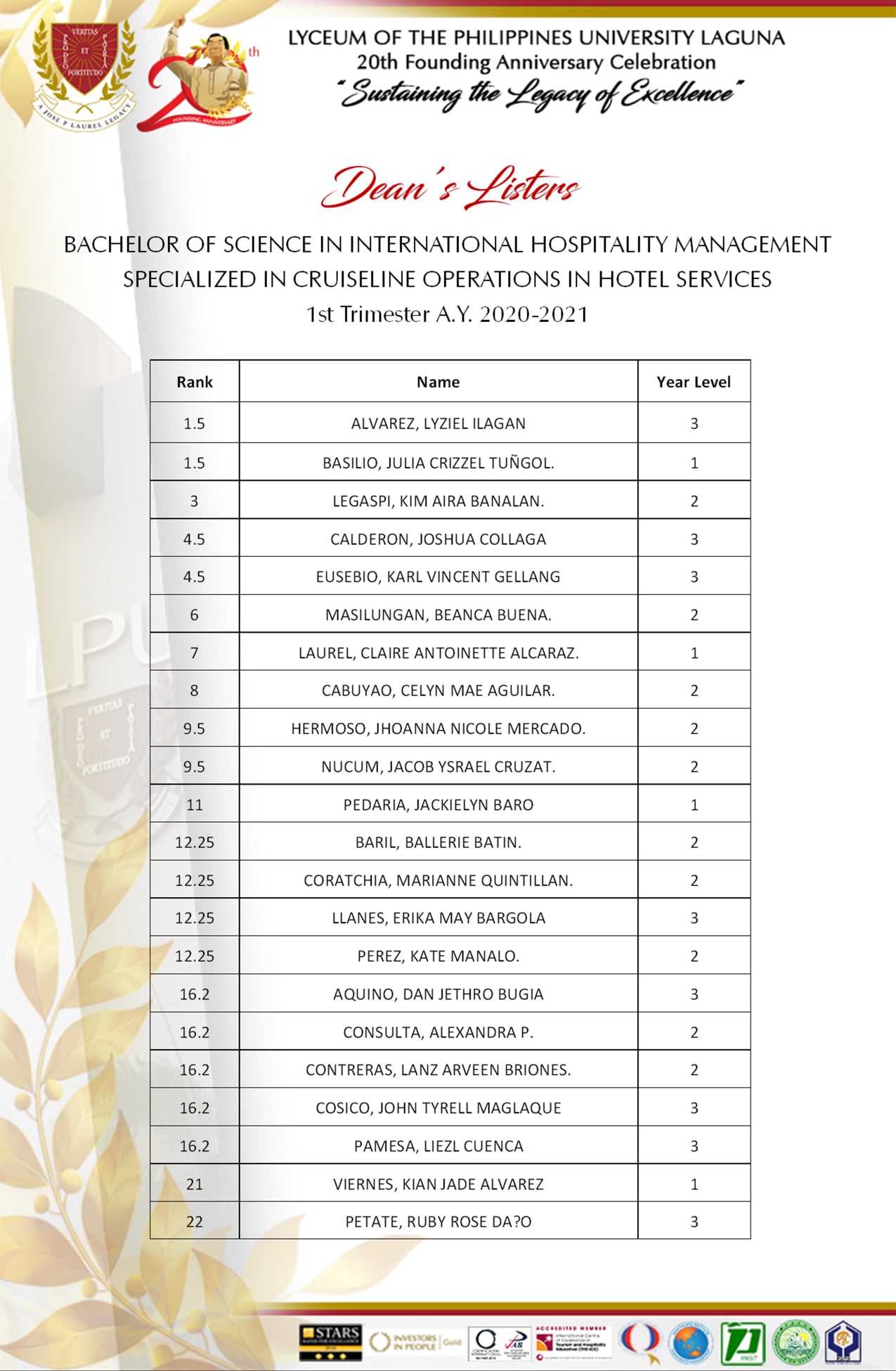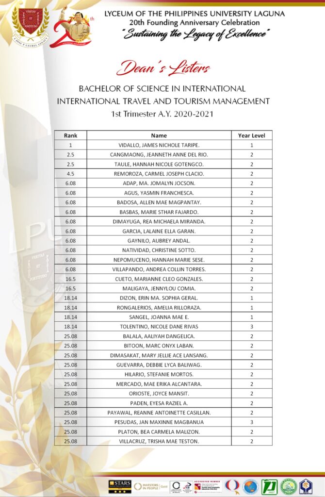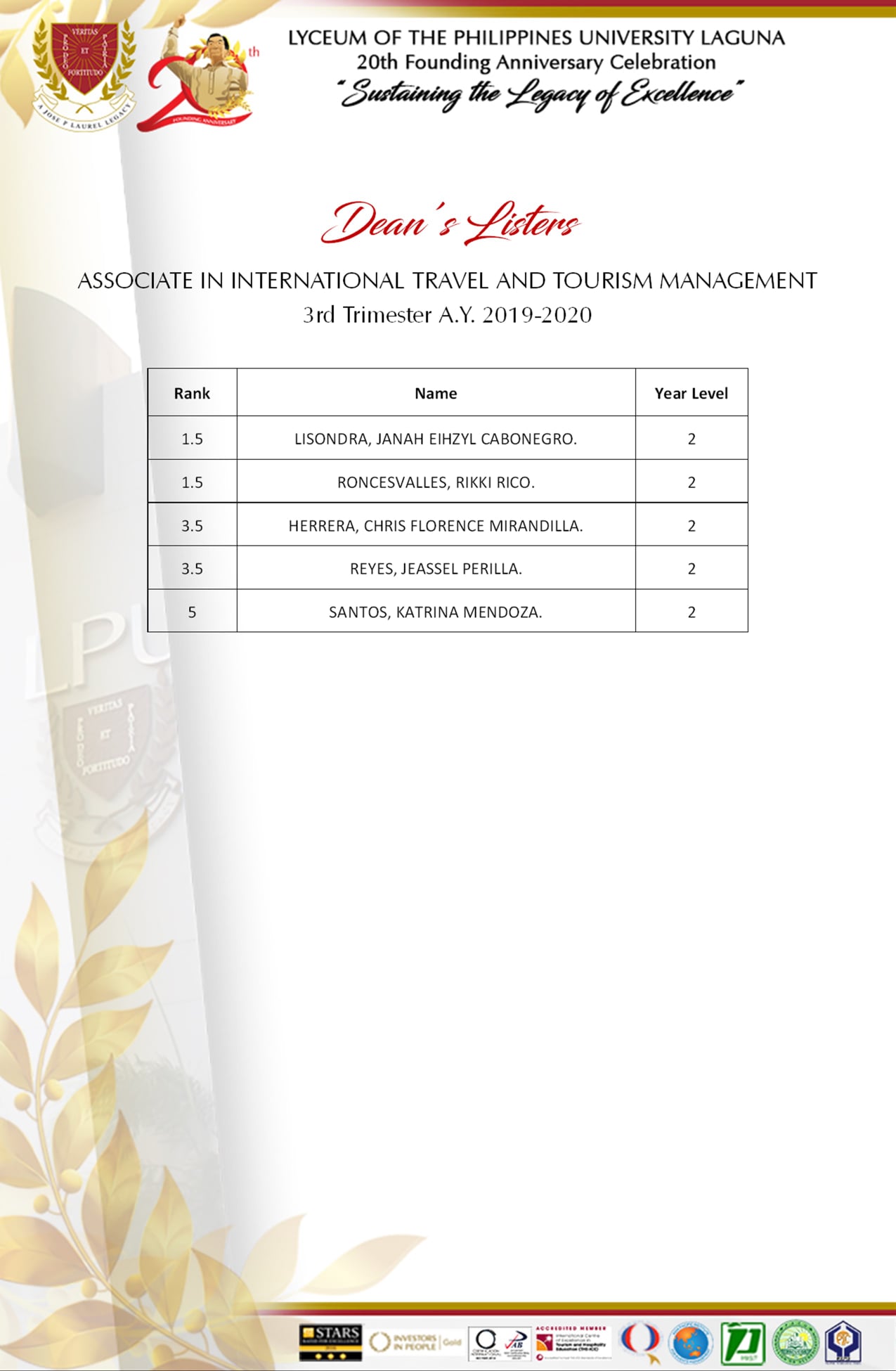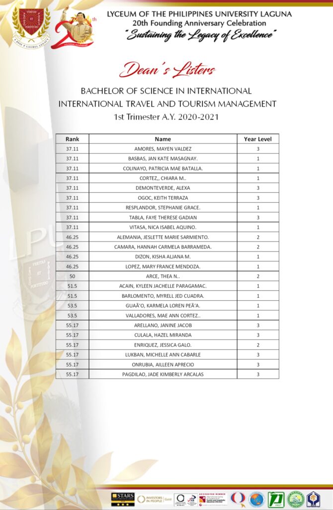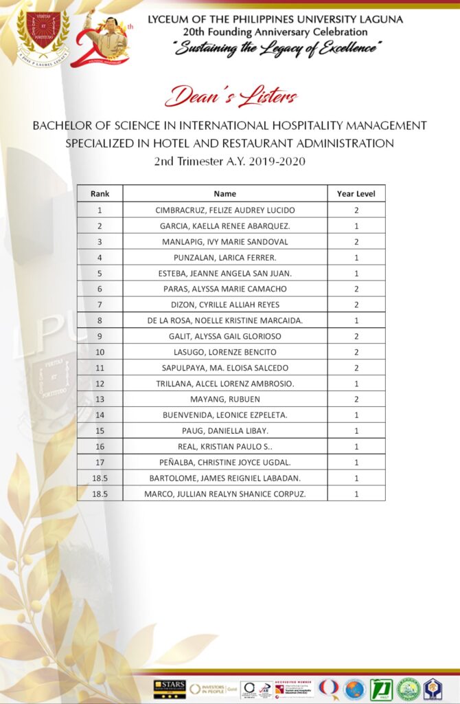 Category: 20th Foundation Celebration, Activity, Dean's Listers RecognitionBy Tristan Jay EstudilloApril 8, 2021 Author: Tristan Jay Estudillo Related postsBridging Minds: Burnout and Balance (LPU-SC Event)June 18, 2021The Joy of Giving: Sustaining Our Commitment to ServeMay 30, 2021Congratulations to Micaella Arcemo, one of the Top 80 delegates to the Ayala Young Leaders Congress 2021May 28, 2021How to Join JUMP-START 2021?May 27, 2021JUMP-START 2021: A Webinar on Job Readiness, and Virtual Career Fair of LPU-LagunaMay 24, 2021Virtual Completion Ceremony AY 2019-2020May 20, 2021