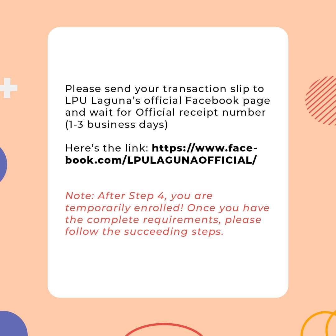 Please send your transaction slip to LPU Laguna’s official Facebook page and wait for Official receipt number (1-3 business days)