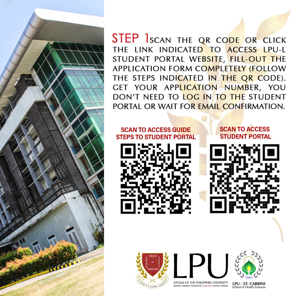 Step 1 Scan the QR Code or click the link indicated to access LPU-L Student Portal Website, fill out the Application form completely (Follow the steps indicated in the QR code). Get your Application Number, you don’t need to Log In to the Student portal or wait for an email confirmation.