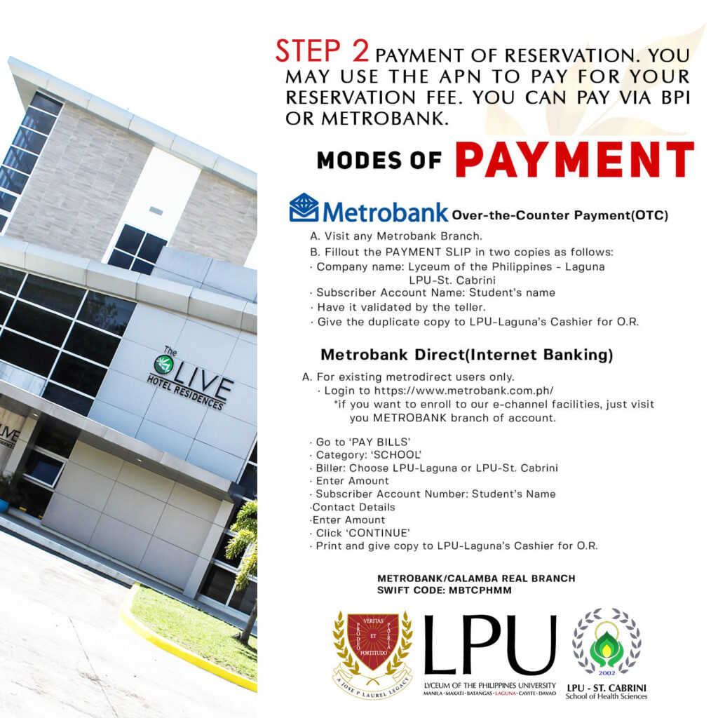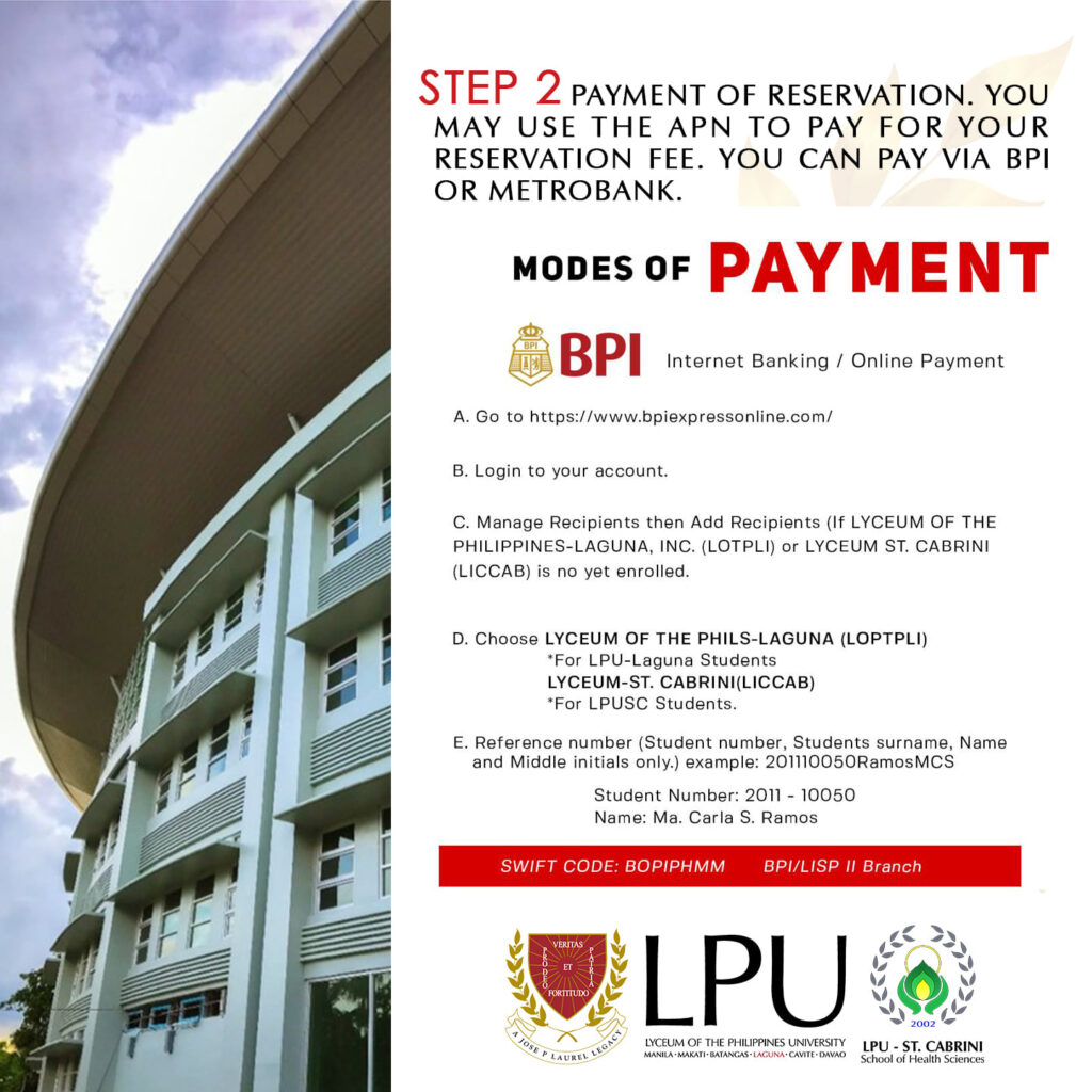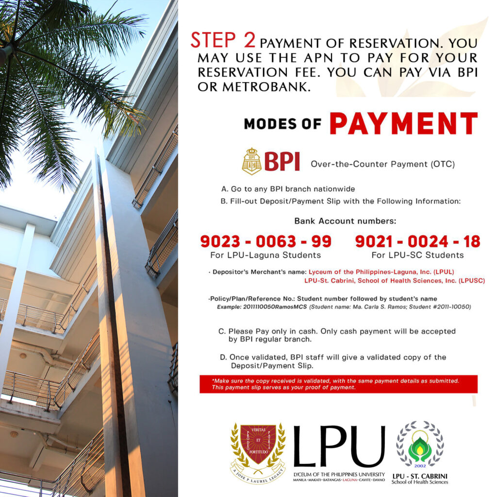 Step 2 Payment of Reservation. You may use the APN to pay for your reservation Fee. You can pay via BPI or Metrobank.