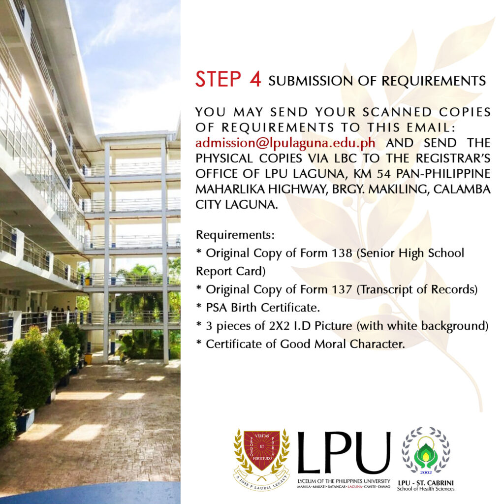 You may send your scanned copies of the requirements to this email: [email protected] and send the Physical Copies via LBC to the Registrar’s Office of LPU Laguna, KM 54 Pan-Philippine Maharlika Highway, Brgy. Makiling, Calamba City Laguna.
