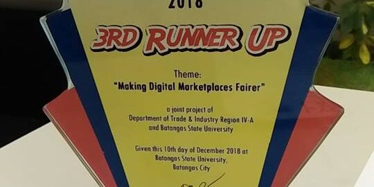The winning entry, “SRP”, bested 9 schools in the region. The said entry was awarded as the champion in DTI Laguna’s competition that leveled up in the regional level. The film discussed the importance of smart buying through online market.